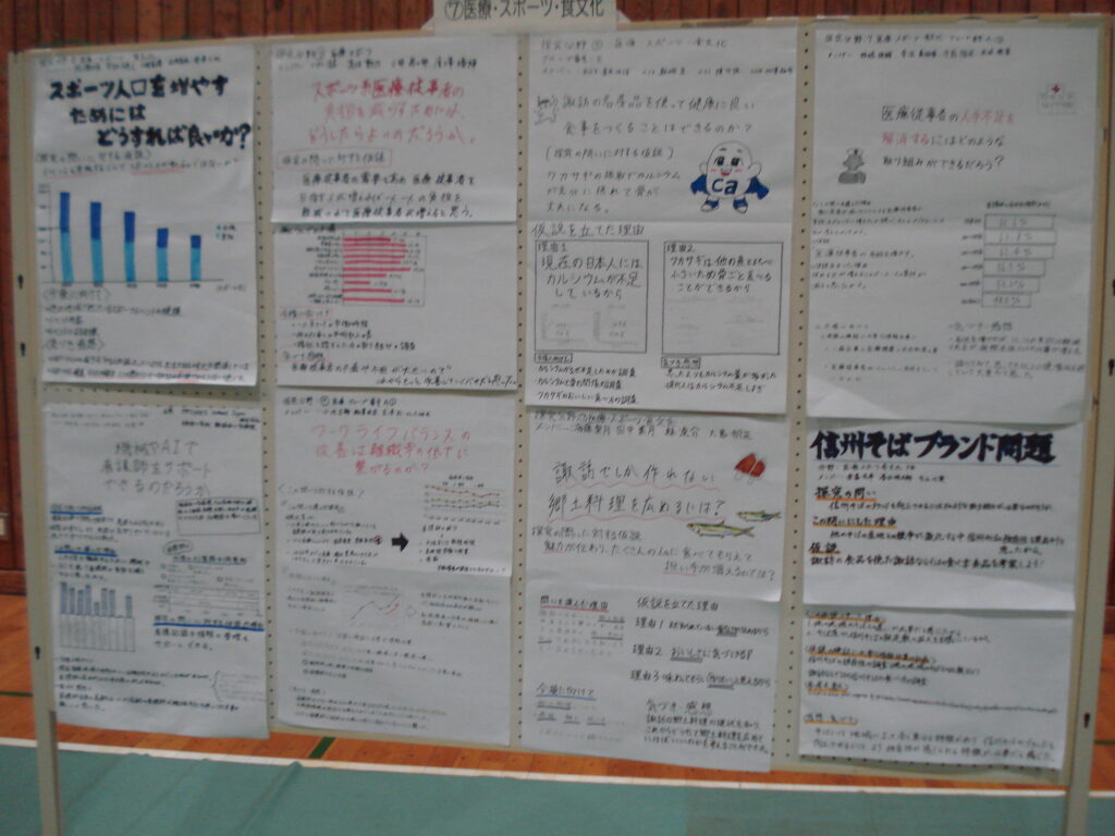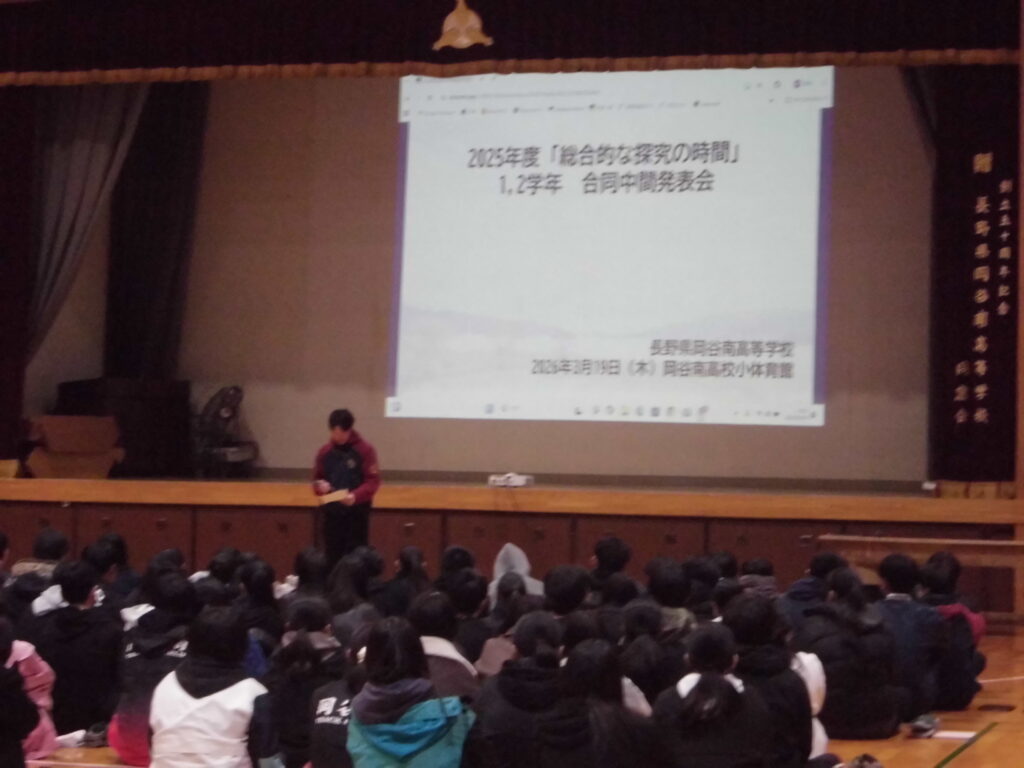 3月19日の2・3時間目に1・2学年合同の「総合的な探究の時間」の中間発表会を行いました。 1年生は私たちが住む諏訪について考える「スミカプロジェクト」を分野ごとのグループになって探究してきました。中間発表会では、各分野の代表グループが発表しました。 代表以外のグループはポスターで探求の成果を発表しました。2年生は、1人1人が自分の興味のあることを深める「マイプロジェクト」を探究してきました。 、各クラスの代表が発表しました。緊張した雰囲気で始まった発表会もそれぞれの発表を熱心に聞く姿が印象的でした。 学年を越えた発表会であったため、来年の探究や進路にむけて新しい視点の刺激があったのではないでしょうか。